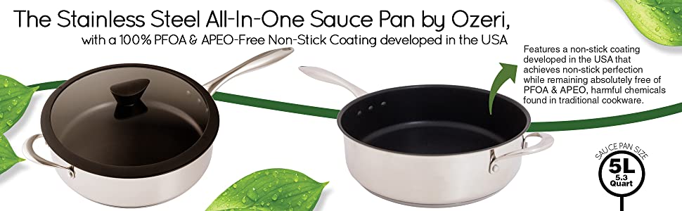 Featuring ETERNA -- a safe and durable non-stick coating developed in the USA, the All-In-One Stainless Steel Sauce Pan by Ozeri achieves non-stick perfection without using PFOA or APEO -- harmful chemicals often found in traditional cookware. Conventional sauce pans achieve their non-stick performance with the aid of PFOA (PerFluoroOctanoic Acid), which the EPA has classified as a 'persistent pollutant of the environment' and APEO (Alkylphenol ethoxylates), which are under restricted use in Germany due to environmental concerns about their poor biodegradability and toxicity in the food chain. According to the EPA, once ingested, PFOA is capable of remaining in people for a very long time, and has been shown to cause developmental and other adverse effects in laboratory animals. Likewise, European studies have shown that APEO may be toxic to aquatic life, and has the potential to act as endocrine disrupters. With the Stainless Steel Sauce Pan's ETERNA coating, even under high temperatures, no such controversial perfluorinated chemicals are ever passed on to you, or released into the environment.