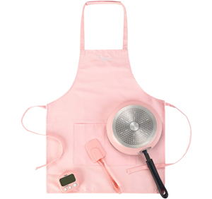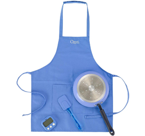 Color-coordinated junior chef cooking set includes a 9.5" frying pan, apron, spatula and kitchen timer.