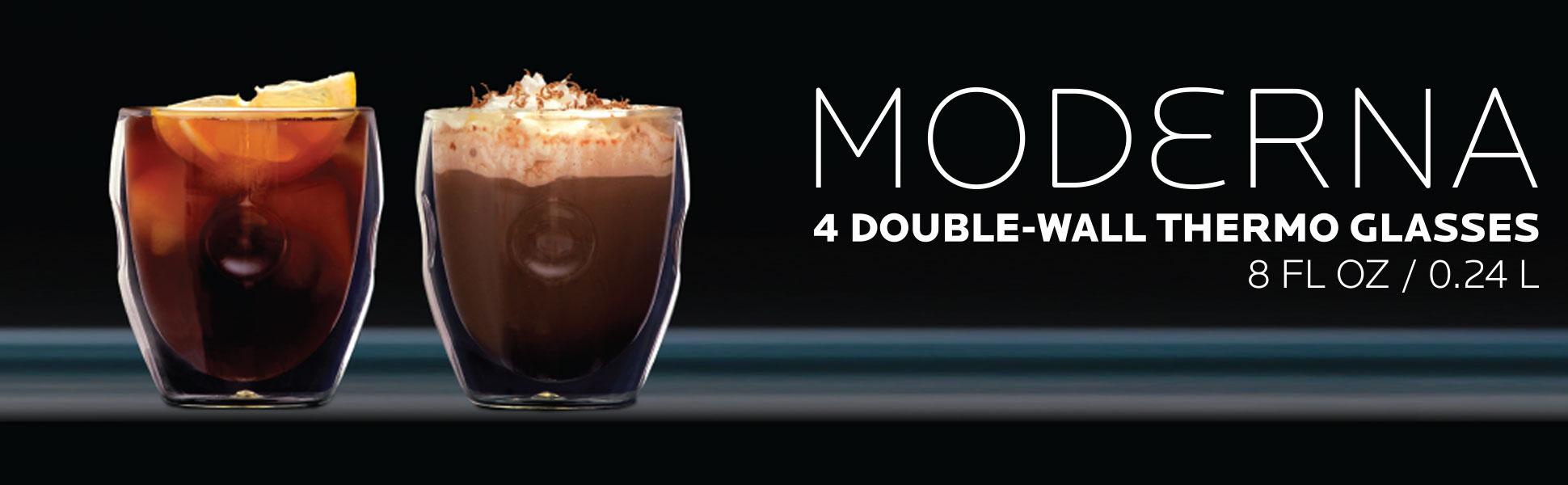 Each glass is made to keep your hands cool even with your hottest drinks, and free of condensation with your chilled beverages. Whether it is an occasion for an espresso or some other beverage, borosilicate glass is completely resistant to acids, and your Ozeri glasses will never lose their original sheen. The patented MODERNA glasses are great for coffee, cappuccinos, hot or iced teas, cocktails, frozen beverages and much more. Each set contains 4 handmade 8 oz glasses designed for lifetime use. The MODERNA glasses are completely microwave and freezer safe, and ship in an elegantly printed and carefully packaged box with a No-Hassle warranty.
