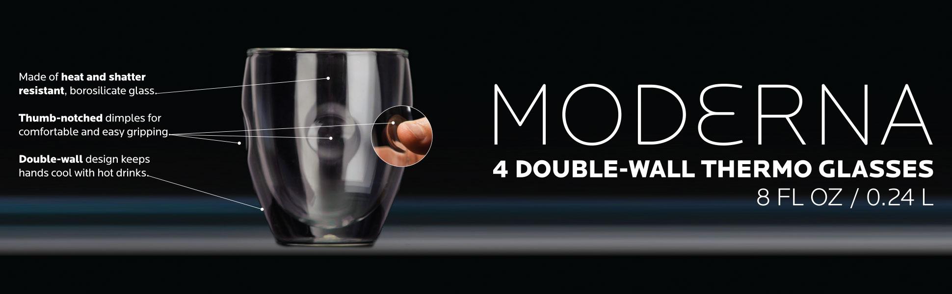 Made of durable, heat and condensation-resistant, mouth-blown borosilicate glass of the finest quality, the newly improved MODERNA glasses belong to the Ozeri Artisan Series of award-winning handcrafted drinkware. Each glass features MODERNA's double-walled design that suspends beverages within an inner wall for the ultimate insulation, preserving drinks at their ideal temperature. The MODERNA's opposing mouth-blown dimples make for a natural and effortless grip.