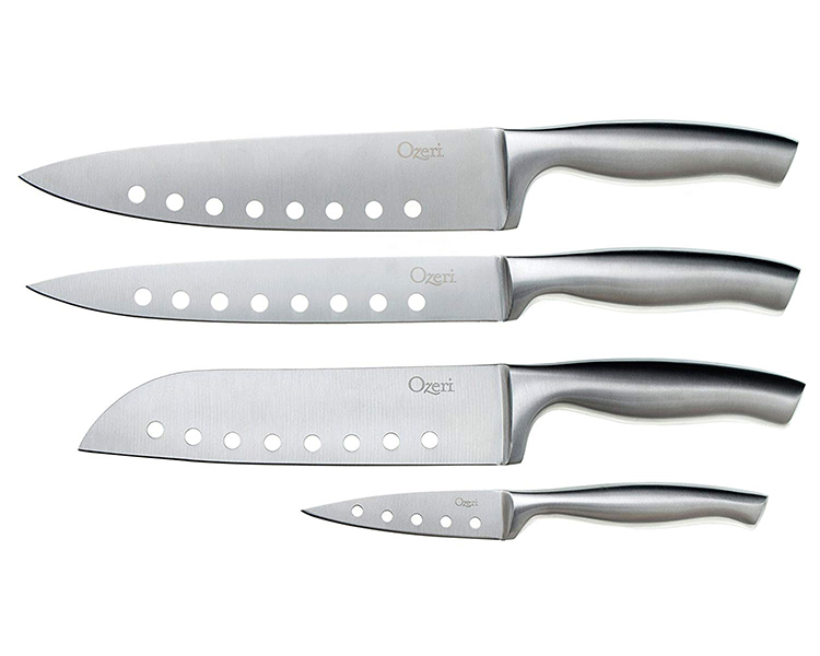 For kitchens demanding the finest in cutlery, the Ozeri 5-Piece Stainless Steel Knife and Sharpener Set, answers the call. Boasting handcrafted blades made of ultra-durable imported Japanese stainless steel, and 430 grade stainless steel handles, the Ozeri 5-Piece Stainless Steel Knife and Sharpener Set instills a sense of thrill into every cutting task. The knives include an 8” Chef Knife, an 8” Slicing Knife, a 7" Santoku Knife and a 3.5” Utility Knife. Crafted from a single-piece design with perfectly balanced ergonomic hollow handles for impeccable stability and control, each knife is completely tarnish, stain, rust and odor-resistant, and finished in elegant satin.