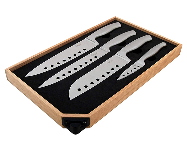 The knives ship in a sustainably-sourced wooden knife case with a built-in knife sharpener for lifetime performance. The blades are exclusively made of certified 420J2-grade Japanese stainless steel that cuts, chops, minces and slices with supreme ease, and feature slots for effortless cleaning. A refined companion for the serious chef, the Ozeri 5-Piece Stainless Steel Knife and Sharpener Set ships with Ozeri's pledge of 100% Satisfaction. Blades made from imported Japanese Stainless Steel. Knives assembled in China.