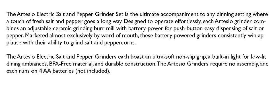 The Artesio Electric Salt and Pepper Grinder Set is the ultimate accompaniment to any dinning setting where a touch of fresh salt and pepper goes a long way. Designed to operate effortlessly, each Artesio grinder combines an adjustable ceramic grinding burr mill with battery-power for push-button easy dispensing of salt or pepper. Marketed almost exclusively by word of mouth, these battery powered grinders consistently win applause with their ability to grind salt and peppercorns. The Artesio Electric Salt and Pepper Grinders each boast an ultra-soft non-slip grip, a built-in light for low-lit dining ambiances, BPA-Free material and durable construction. The Artesio Grinders require no assembly and each runs on 4 AA batteries (not included).
