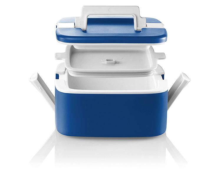 - Double-wall thermal insulation that keeps hot and cold dishes near their serving temperature throughout the day
