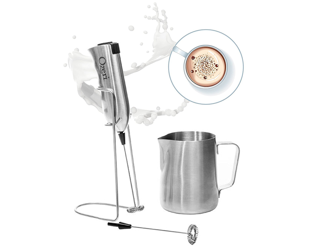 The powerful motor in the Ozeri Milk Frother spins at over 15,000 RPMs and activates instantly with results in 10 to 20 seconds. The Ozeri Milk Frother foams all kinds of milk (whole/regular/skim milk, soy milk, almond milk and coconut milk) alike for fluffy hot cafe lattes or cold chocolate malts in seconds. The Ozeri Stainless Steel Milk Frothing Set is made of food and drink-safe materials, and ships with the electric frother, stand, extra frothing attachment, pitcher and 2 AA batteries. Your satisfaction is guaranteed.