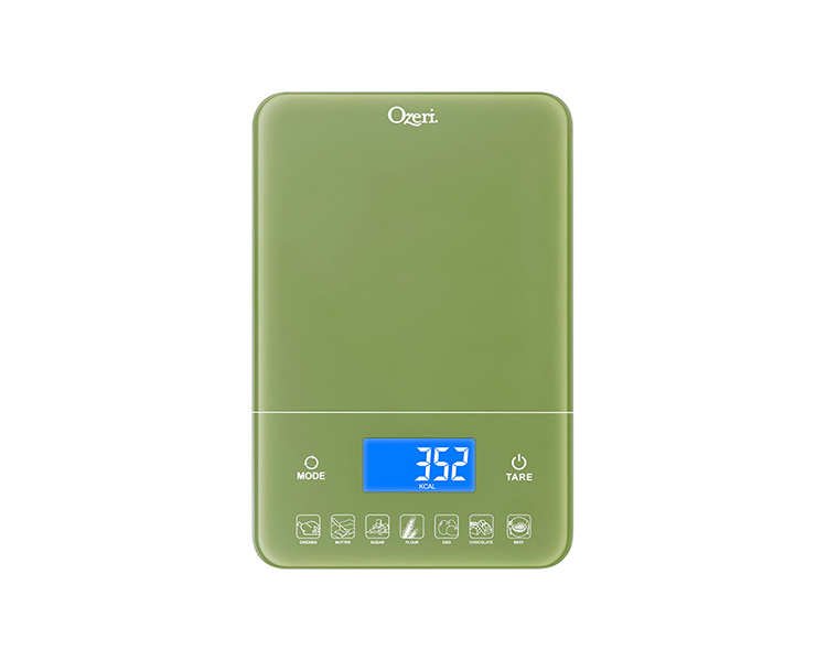 Introducing the Ozeri Touch III 22 lbs (10 kg) Digital Kitchen Scale with Calorie Counter, in Black Tempered Glass. Designed to simplify, the Ozeri Touch III features a built-in calorie counter helps you calculate and track your daily caloric intake for 7 of the most commonly weighed food items (butter, sugar, flour, eggs, chocolate, chicken or beef). Simply place the food item on Touch III's large weighing platform, and with the push of a button instant caloric (Kcal) values are displayed the scale's large high-contrast LED display. Used by dietitians and nutritionists worldwide, the Touch III is equipped with high-precision sensor technology that weighs from 0.05 oz to 22 lbs / 1 g to 10 kg in units of 0.05 oz or 1 g.