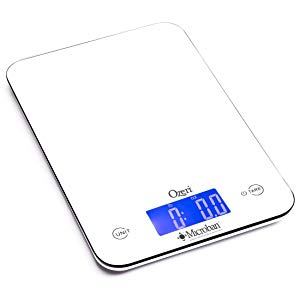 With the Ozeri Touch II Kitchen Scale, the Microban antimicrobial protection is built-in to the scale and will never wash off or wear away! The Ozeri Touch II Kitchen Scale combines new advanced touch sensitive buttons, high-precision GFX sensors and a celebrated design with an elegant reflective white surface. It has a capacity range from a mere 0.05 ounces to 18 lbs., or 1 gram to 8000 grams. The Touch II provides measurements in graduations of 1 g or 0.05 oz. and it boasts a high-contrast blue backlit LCD screen that is easy to read. Its 4 high precision GFX latest generation sensors deliver superior accuracy and the fastest response times for the quick paced chef.