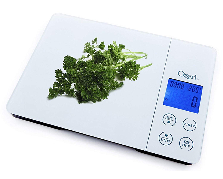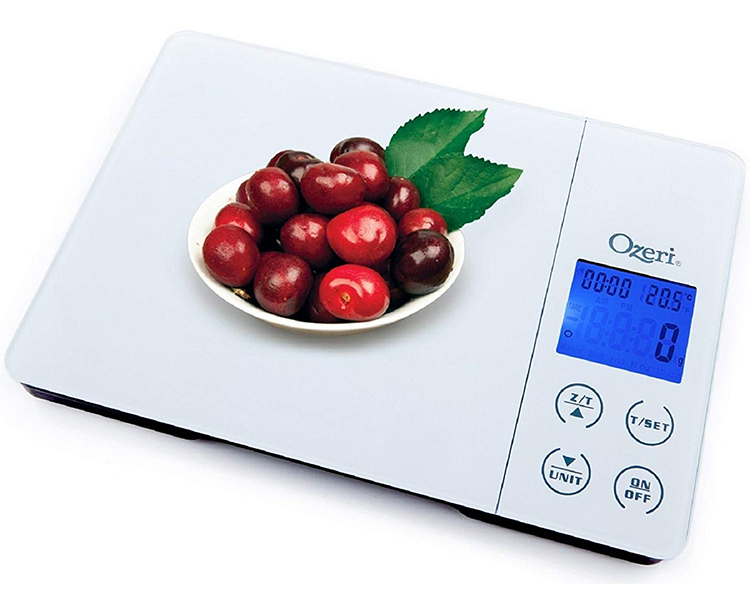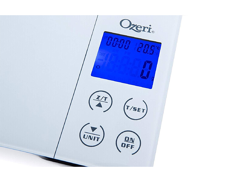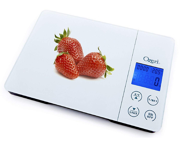 Designed for the culinary perfectionist, the new Ozeri Gourmet Digital Kitchen Scale combines an award-winning wide platform design, a kitchen alarm timer, temperature display, touch sensitive buttons, and the latest in sensor technology for superior accuracy. The Gourmet's 4 touch sensitive buttons provide immediate access to all the scale's functions, including the convenient Unit conversion button and the always handy Tare feature. The uniquely designed wide tempered glass platform provides an oversized weighing area coupled to 4 high-precision GFX sensors that accurately weigh 0.4 oz to 11 lbs or 1 g to 5000 g. The Gourmet ships with 2 AAA batteries included and an easy-access battery compartment (no screwdriver necessary).
