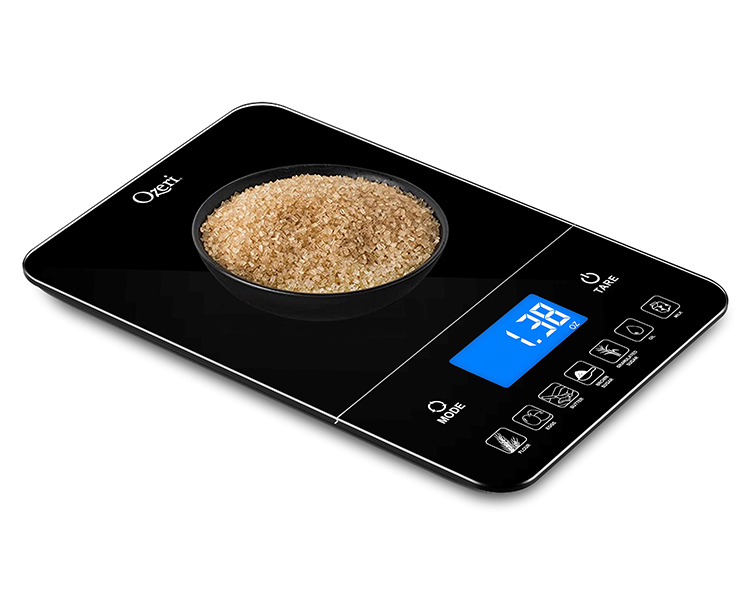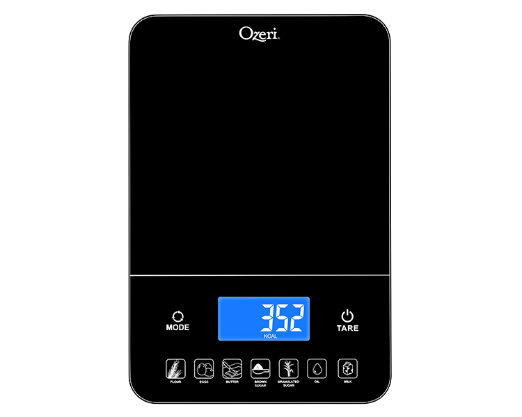 Introducing the Ozeri Touch III 22 lbs (10 kg) Baker's Kitchen Scale with Calorie Counter, in Tempered Glass. Designed for baker’s, the Ozeri Touch III Baker’s Scale features a built-in calorie counter that helps you calculate and track your daily caloric intake for 7 of the most commonly weighed baking ingredients (flour, eggs, butter, brown sugar, granulated sugar, oil or milk). Simply place the baking ingredient on the Touch III's large weighing platform, and with the push of a button instant caloric (Kcal) values are displayed on the scale's large high-contrast LED display. Offering the best in form and function, the Ozeri Touch III Baker's Scale features a touch-sensitive Tare button that quickly subtracts the weight of the bowl, tray or plate being used, to calculate the net weight of your ingredients with ease. Used by chefs, dietitians and nutritionists, the Touch III Baker’s Scale is also a most capable multi-purpose food scale and equipped with high-precision sensor technology that weighs from 0.05 oz to 22 lbs / 1 g to 10 kg, in precise units of 0.05 oz or 1 g. The Touch III features a touch-sensitive Unit button for effortless unit conversion between ounces, pounds, grams and milliliters. The Ozeri Touch III 22 lbs (10 kg) Baker's Kitchen Scale boasts a contemporary design that complements any modern kitchen, and ships with 4 AAA batteries included. It provides both Low Battery and Overload indicators, and automatically turns off after 2 minutes of inactivity.