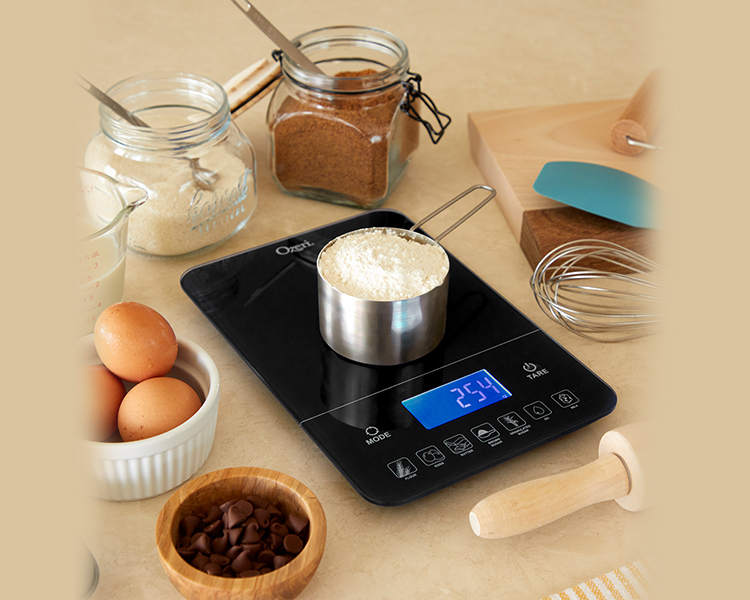 - Touch-button provides instant caloric (Kcal) values based on the portion of flour, eggs, butter, brown sugar, granulated sugar, oil or milk placed on the scale.