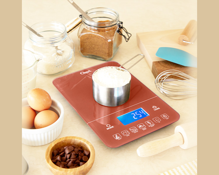 - Touch-button provides instant caloric (Kcal) values based on the portion of flour, eggs, butter, brown sugar, granulated sugar, oil or milk placed on the scale.