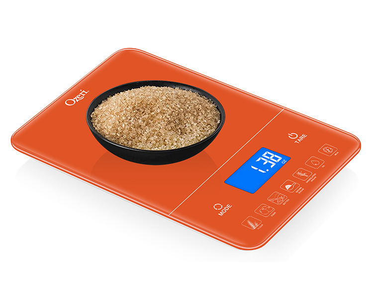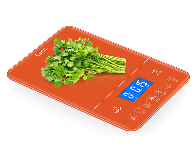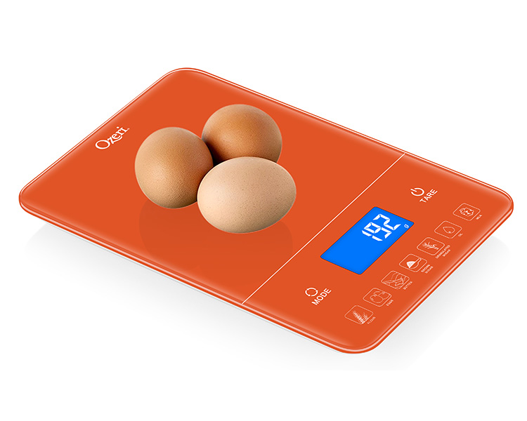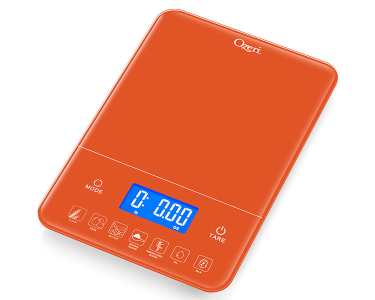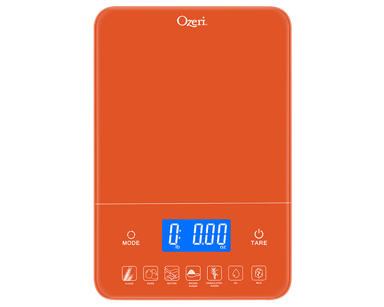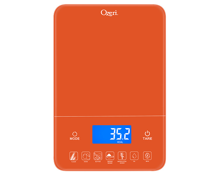 Introducing the Ozeri Touch III 22 lbs (10 kg) Baker's Kitchen Scale with Calorie Counter, in Tempered Glass. Designed for baker’s, the Ozeri Touch III Baker’s Scale features a built-in calorie counter that helps you calculate and track your daily caloric intake for 7 of the most commonly weighed baking ingredients (flour, eggs, butter, brown sugar, granulated sugar, oil or milk). Simply place the baking ingredient on the Touch III's large weighing platform, and with the push of a button instant caloric (Kcal) values are displayed on the scale's large high-contrast LED display. Offering the best in form and function, the Ozeri Touch III Baker's Scale features a touch-sensitive Tare button that quickly subtracts the weight of the bowl, tray or plate being used, to calculate the net weight of your ingredients with ease. Used by chefs, dietitians and nutritionists, the Touch III Baker’s Scale is also a most capable multi-purpose food scale and equipped with high-precision sensor technology that weighs from 0.05 oz to 22 lbs / 1 g to 10 kg, in precise units of 0.05 oz or 1 g. The Touch III features a touch-sensitive Unit button for effortless unit conversion between ounces, pounds, grams and milliliters. The Ozeri Touch III 22 lbs (10 kg) Baker's Kitchen Scale boasts a contemporary design that complements any modern kitchen, and ships with 4 AAA batteries included. It provides both Low Battery and Overload indicators, and automatically turns off after 2 minutes of inactivity.