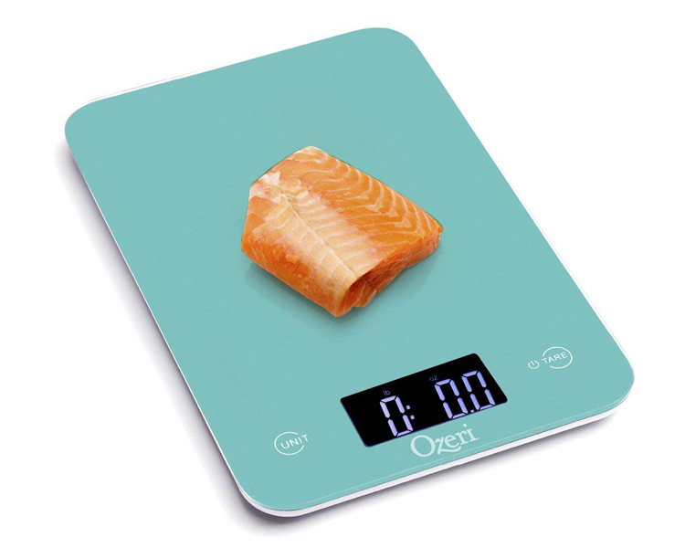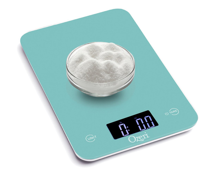 Combining new advanced touch sensitive buttons, a tempered glass surface, and new GFX sensors, the Ozeri Touch is one of the industry's most advanced digital kitchen scales. The Ozeri Touch Digital Kitchen Scale features an elegant reflective colored surface made out of high quality tempered glass that is 4 times stronger than normal glass. It includes 4 high-precision sensors to deliver superior accuracy and the fastest response times for the quick paced chef. The Ozeri Touch Digital Kitchen Scale combines all this technology into a contemporary thin design that stands out as a show piece for the modern kitchen. Designed for the culinary perfectionist who desires superior accuracy and a showpiece design, the Ozeri Touch is one of the lightest kitchen scales on the market and offers easy portability. The Ozeri Touch also features an automatic Tare button that quickly calculates the net weight of your ingredients by subtracting the container weight, whether the container is a bowl, tray or plate. The Ozeri Touch Digital Kitchen Scale has a capacity range from a mere 0.05 ounce to 12 pounds and 10.8 ounces (1 gram to 5750 grams), and provides measurements in graduations of 1 g or 0.05 oz on its bright LCD screen. The scale also displays results in both the US and international metric systems (grams | ounces | pounds | kilograms). The large screen features a new bright LCD with an improved viewing angle for the on-the-move chef, and provides Low Battery and Overload indicators. The Ozeri Touch Digital Kitchen Scale comes equipped with 2 removable Lithium batteries for extended life, and automatically powers off after 2 minutes of inactivity to preserve battery life.