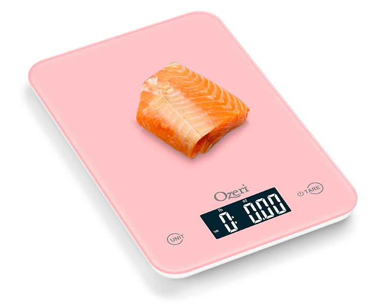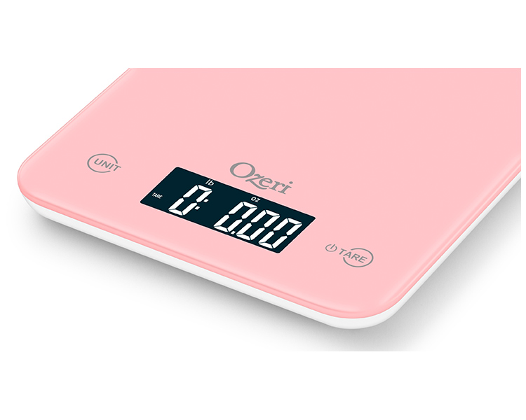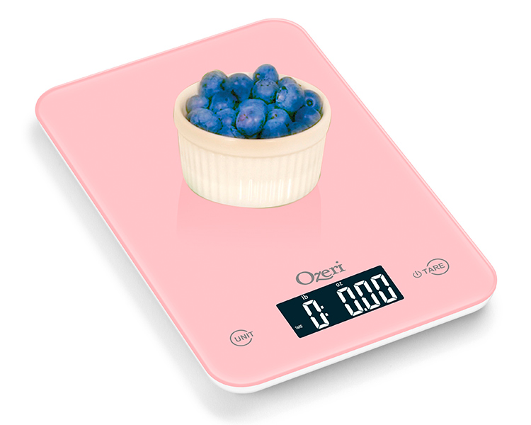 Combining new advanced touch sensitive buttons, a tempered glass surface, and new GFX sensors, the Ozeri Touch is one of the industry's most advanced digital kitchen scales. The Ozeri Touch Digital Kitchen Scale features an elegant reflective colored surface made out of high quality tempered glass that is 4 times stronger than normal glass. It includes 4 high-precision sensors to deliver superior accuracy and the fastest response times for the quick paced chef. The Ozeri Touch Digital Kitchen Scale combines all this technology into a contemporary thin design that stands out as a show piece for the modern kitchen. Designed for the culinary perfectionist who desires superior accuracy and a showpiece design, the Ozeri Touch is one of the lightest kitchen scales on the market and offers easy portability. The Ozeri Touch also features an automatic Tare button that quickly calculates the net weight of your ingredients by subtracting the container weight, whether the container is a bowl, tray or plate. The Ozeri Touch Digital Kitchen Scale has a capacity range from a mere 0.05 ounce to 12 pounds and 10.8 ounces (1 gram to 5750 grams), and provides measurements in graduations of 1 g or 0.05 oz on its bright LCD screen. The scale also displays results in both the US and international metric systems (grams | ounces | pounds | kilograms). The large screen features a new bright LCD with an improved viewing angle for the on-the-move chef, and provides Low Battery and Overload indicators. The Ozeri Touch Digital Kitchen Scale comes equipped with 2 removable Lithium batteries for extended life, and automatically powers off after 2 minutes of inactivity to preserve battery life.