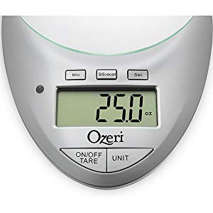 The Ozeri Pro II Digital Kitchen Scale includes a convenient Unit button that instantly converts the weight displayed on the LCD screen between oz, g, lbs, and kg (ounces | grams | pounds | kilograms). The new countdown kitchen timer offers an audible beep, blinking LED, or combined audible and visual alarm for the fast-paced chef. The scale's weighing platform is made of durable glass, and the large screen features a new bright LCD with an improved viewing angle.