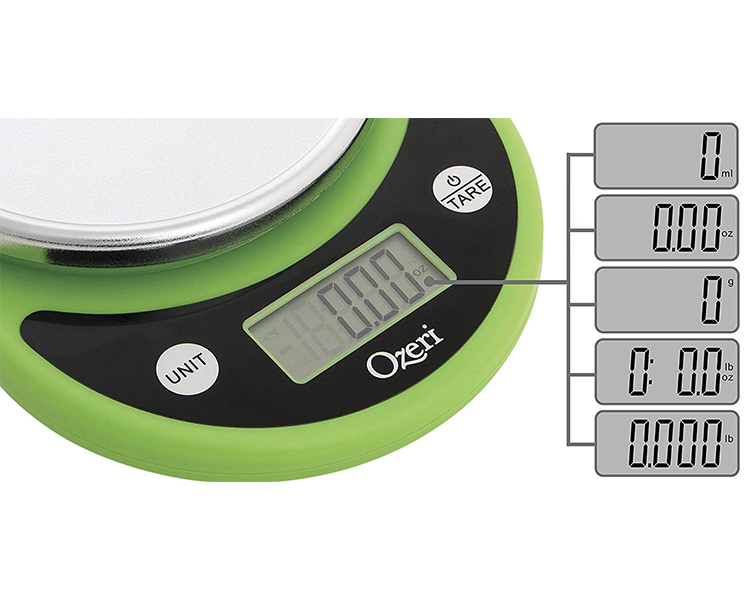 - Precision you can rely on -- Accurate, elegant, and effortless to use, the updated Pronto kitchen scale now features Ozeri’s Variable Graduation Technology for ultra‑fine measurements: 0.1 g increments below 1000 g and 0.5 g increments up to 6000 g (or 0.001 oz below 100 oz and 0.01 oz up to 211.6 oz).