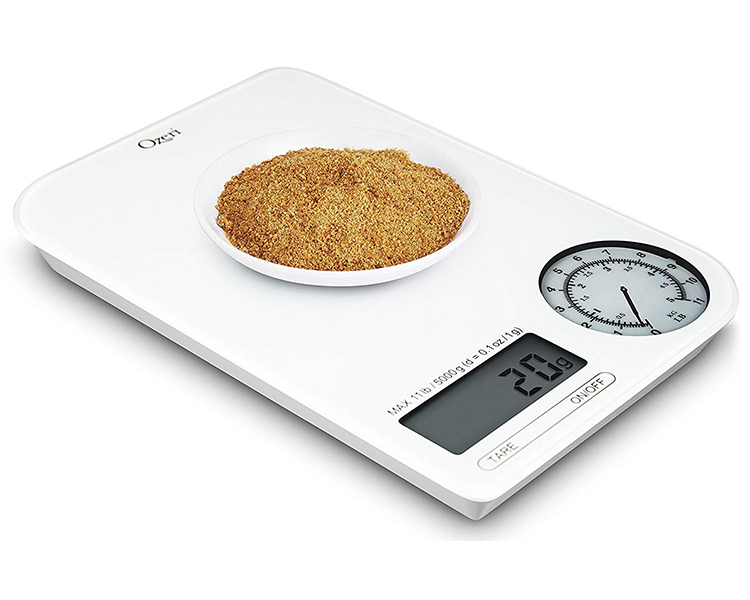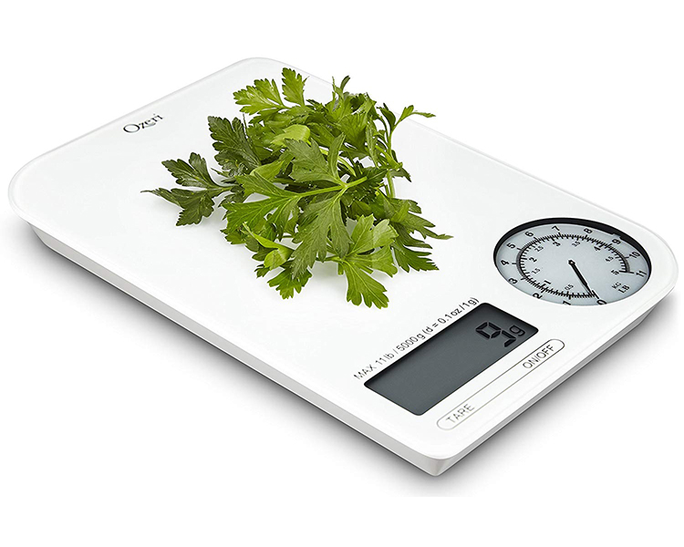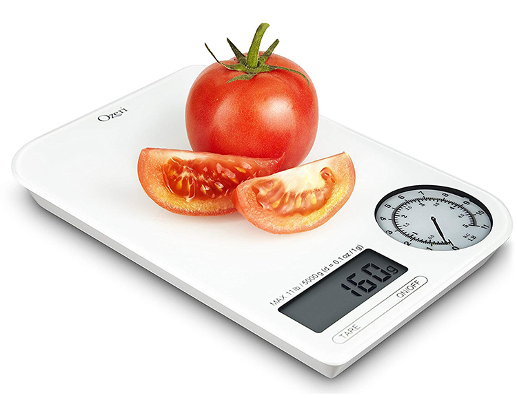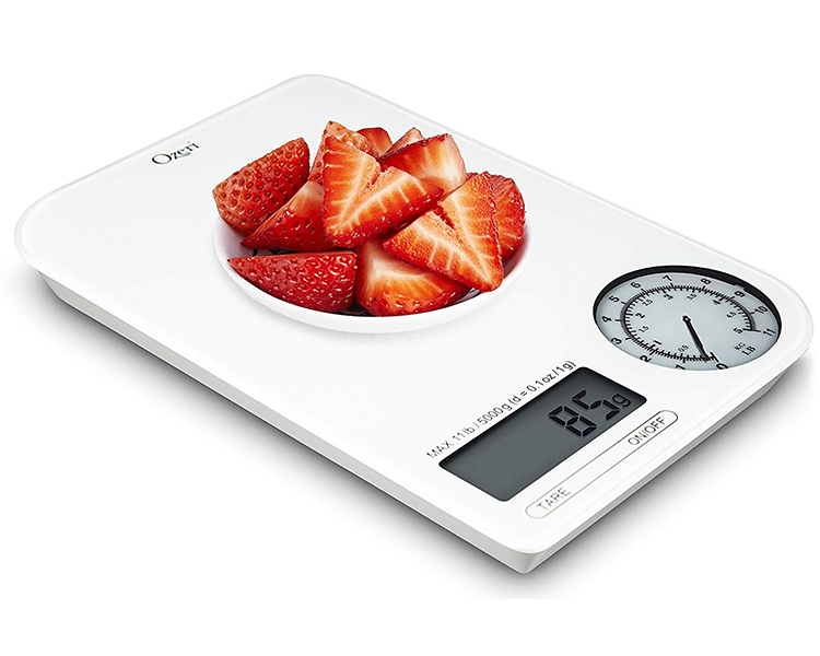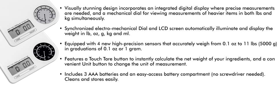 - Visually stunning design incorporates an integrated digital display where precise measurements are needed, and a mechanical dial for viewing measurements of heavier items in both lbs and kg simultaneously.