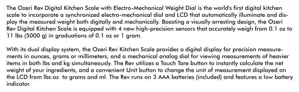 The Ozeri Rev Digital Kitchen Scale with Electro-Mechanical Weight Dial is the world's first digital kitchen scale to incorporate a synchronized electro-mechanical dial and LCD that automatically illuminate and display the measured weight both digitally and mechanically. Boasting a visually arresting design, the Ozeri Rev Digital Kitchen Scale is equipped with 4 new high-precision sensors that accurately weigh from 0.1 oz to 11 lbs (5000 g) in graduations of 0.1 oz or 1 gram. With its dual display system, the Ozeri Rev Kitchen Scale provides a digital display for precision measurements in ounces, grams or millimeters, and a mechanical analog dial for viewing measurements of heavier items in both lbs and kg simultaneously. The Rev utilizes a Touch Tare button to instantly calculate the net weight of your ingredients, and a convenient Unit button to change the unit of measurement displayed on the LCD from lbs:oz to grams and ml. The Rev runs on 3 AAA batteries (included) and features a low battery indicator. Your satisfaction is 100 percent guaranteed.