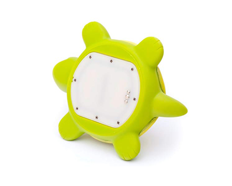 Introducing the Turtlemeter, the first Baby Bath Thermometer built into a fun and safe Turtle Bath Toy. The Turtlemeter activates instantly in water with no annoying buttons or switches. The Turtlemeter dynamically calculates the bath water temperature every second, and displays the temperature with 3 different color screens, with Blue indicating Cold, Red indicating Hot,and Green indicating Just Right. Compliant with the Consumer Product Safety Improvement Act, the Turtlemeter is safe and fun both in and out of the bath. Ships with 3 AAA batteries included.