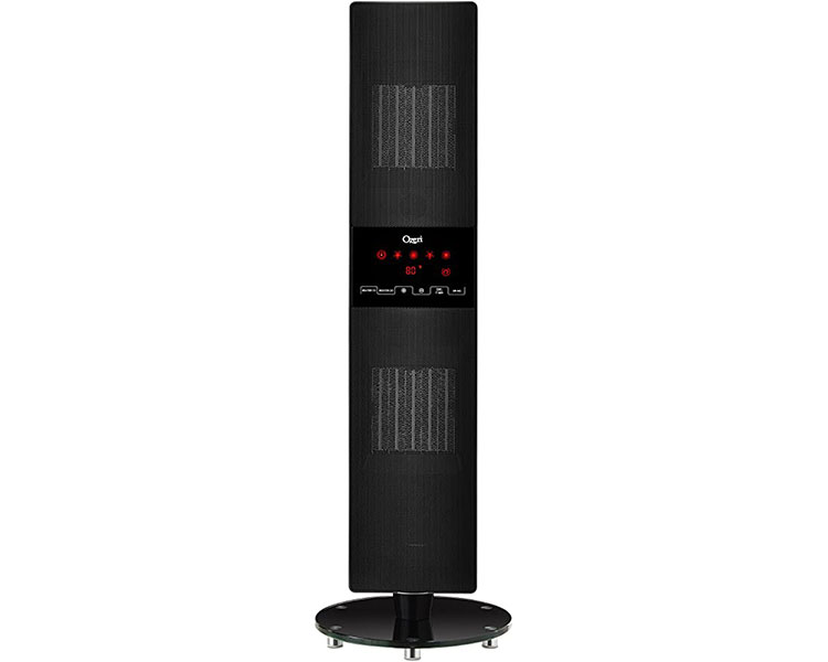 Ozeri is proud to present its OZH1 dual zone oscillating ceramic heater. The Ozeri OZH1 provides rapid heat on a wintry night with a programmable 12-hour timer and thermostat so that you can sleep in comfort. The OZH1 dual zone oscillating ceramic heater features a sleek space-saving design enhances room decor, with a sturdy glass base designed to reduce the occurrence of accidental tip overs. The OZH1 utilizes a touch-button illuminated LED display that boasts a better viewing angle and common LCD displays, and an extended-range remote control unit for maximum convenience. The OZH1 utilizes dual PTC ceramic heating systems to allow for 2 independently controllable heating zones, each with 2 speeds for rapid heat distribution at 800 W (low) or 1500W (high). it also includes overheat protection to prevent irritating dust burning odors, and an intelligent thermostat that adjusts heat output according to the ambient temperature, and automatically turns off when the selected temperature is reached. The OZH1 dual zone oscillating ceramic heater utilizes a new whisper quiet DC motor that generates warming air with the lowest possible noise coefficient, and dismountable dustproof filters for easy cleaning. It measures 33.5 inch in height and includes a Recessed handle for easy transporting. Your satisfaction is guaranteed.
