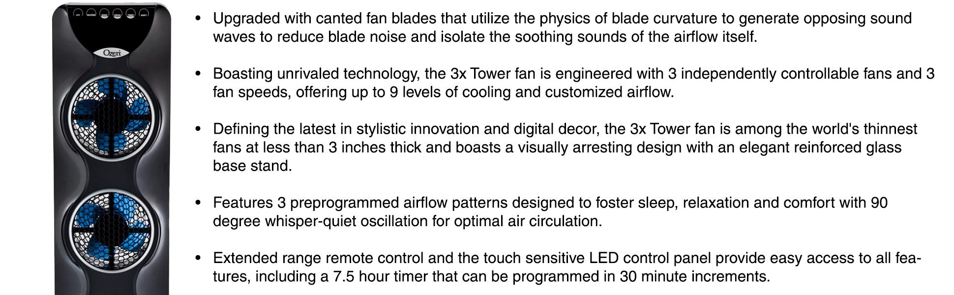 Featuring unrivaled technology, the new Ozeri 3x 44" Tower Fan defines the latest in stylistic innovation and digital decor with its visually stunning design, slim form factor and elegant glass base stand. At less than 3 Inch thick, the 3x Tower fan is one of the world's thinnest fans and boasts 3 independently controllable fans with passive noise cancellation technology for remarkable airflow velocity at less than 50dB. The 3x Tower Fan's passive noise reduction technology utilizes the physics of blade curvature to generate mitigating sound waves that reduce blade noise and help isolate the soothing sounds of the airflow itself. The 3x Tower fan is engineered with 3 independently controllable fans and 3 fan speeds, offering up to 9 levels of cooling and the ultimate in customized airflow.